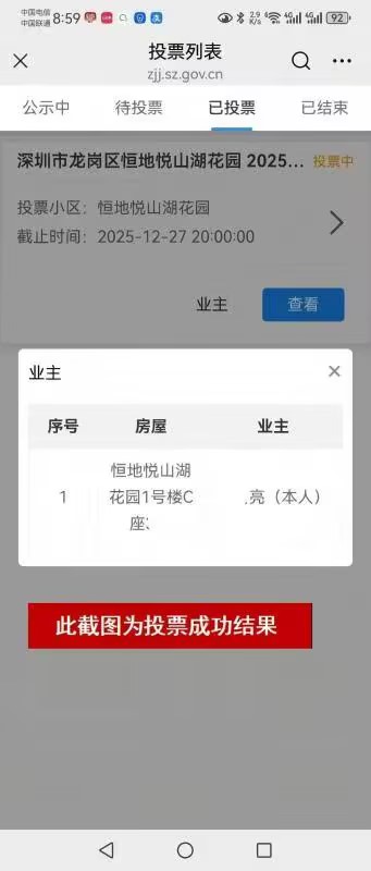 深圳市住房和建设局公众号->业务办理->物业->业主决策->已投票>业主